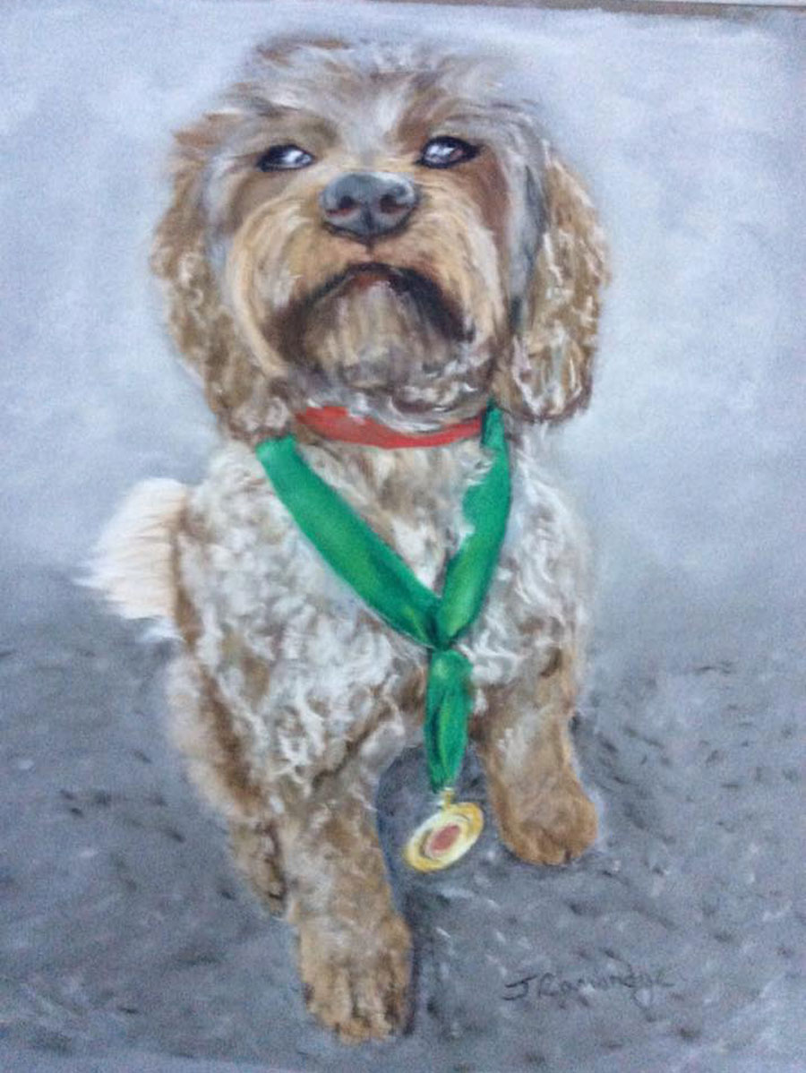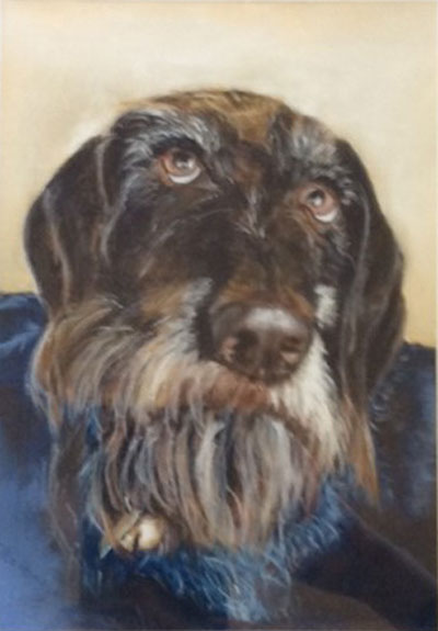 I enjoy painting in several mediums but have found I can portray animals and people best in pastels. The picture of Poppy, I can’t remember her name but she is has a Poppy on her collar, was done from a photo I took on the Shaldon Ferry in June 2017. If the owners see this they can get in touch with me through the Bathampton Art Group Facebook page. Most of my pictures are of pets belonging to friends. |